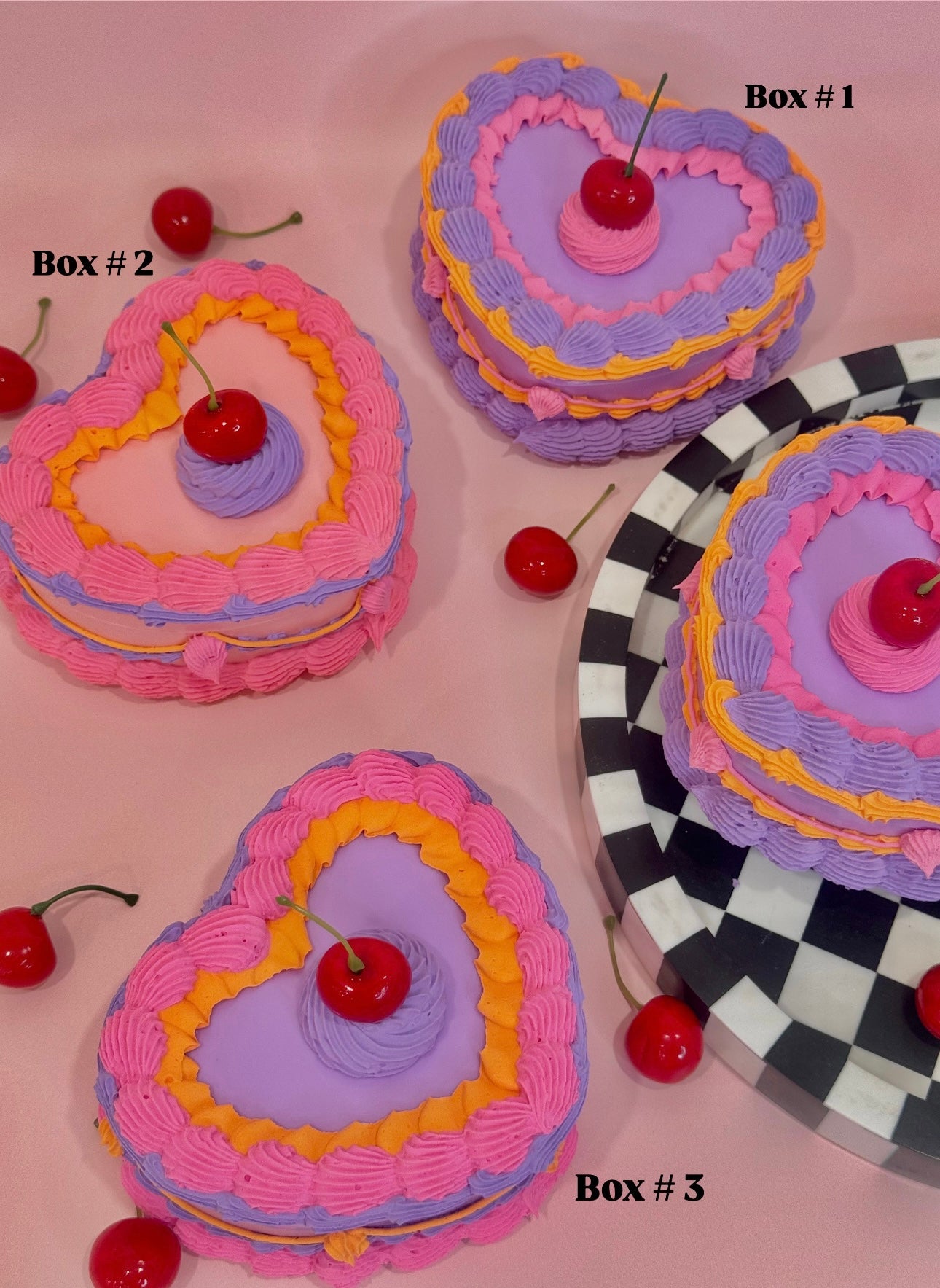 The Fake Cake Vintage Jewelry Boxes are handmade, custom-crafted keepsake boxes. Each box is 5.5 inches wide. They are made to order, decorative only, and not edible.