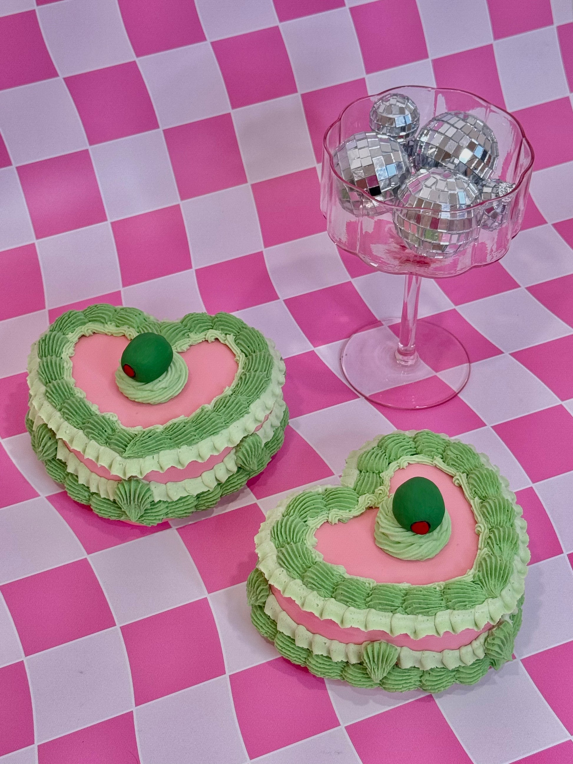 The Fake Cake Vintage Jewelry Boxes are handmade, custom-crafted keepsake boxes. Each box is 5.5 inches wide. They are made to order, decorative only, and not edible.